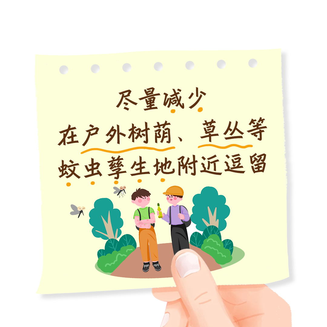 减少蚊媒活动高峰期(日出后2小时和日落前2小时)的户外逗留时间,尽量穿着浅色、宽松的长袖衣裤,减少皮肤暴露。